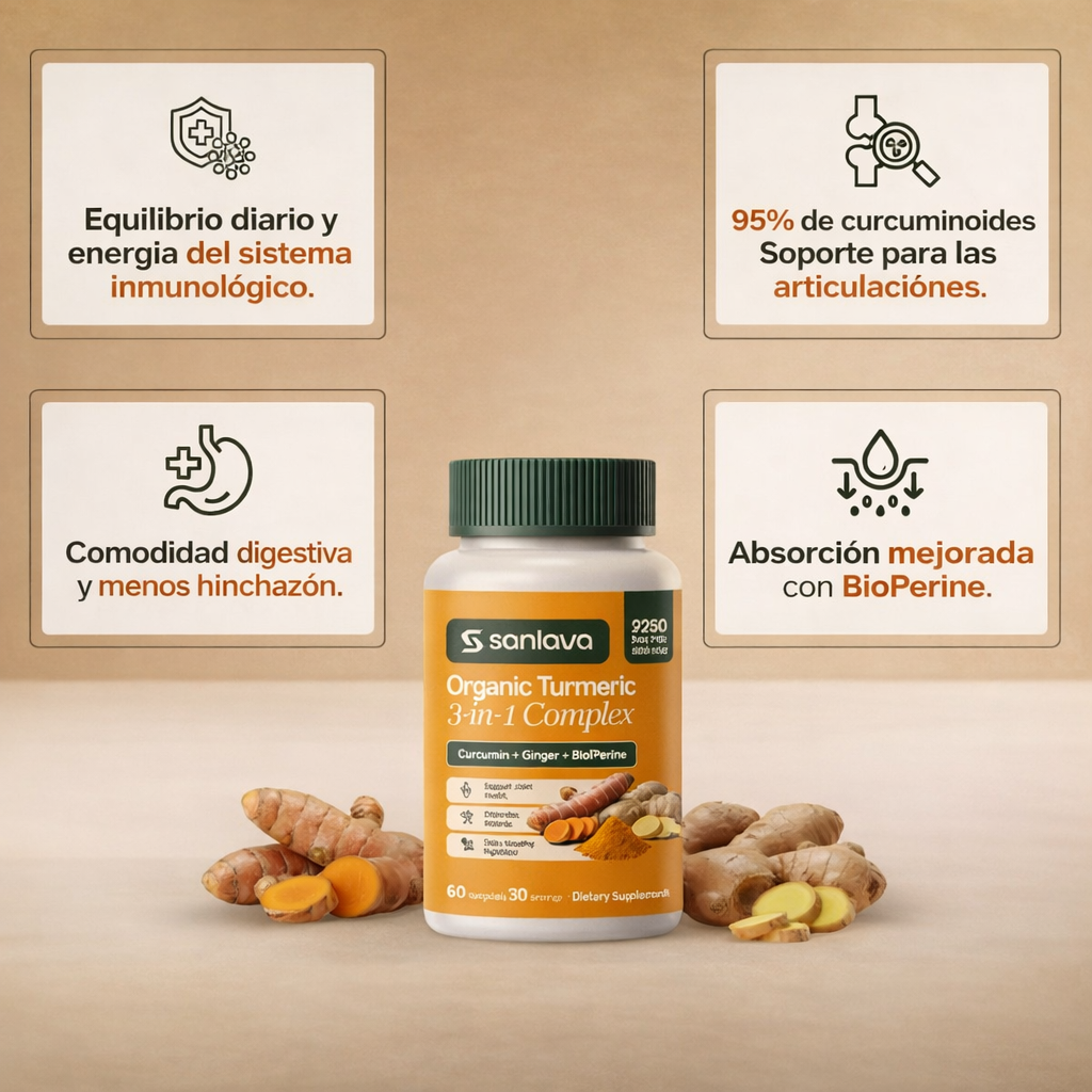 Un suplemento natural de cúrcuma orgánica que combina extracto de cúrcuma con 95% de curcuminoides, jengibre y BioPerine para mejorar la absorción. Está diseñado para personas que buscan una forma natural de apoyar su bienestar general, especialmente en áreas de inflamación, movilidad y digestión.