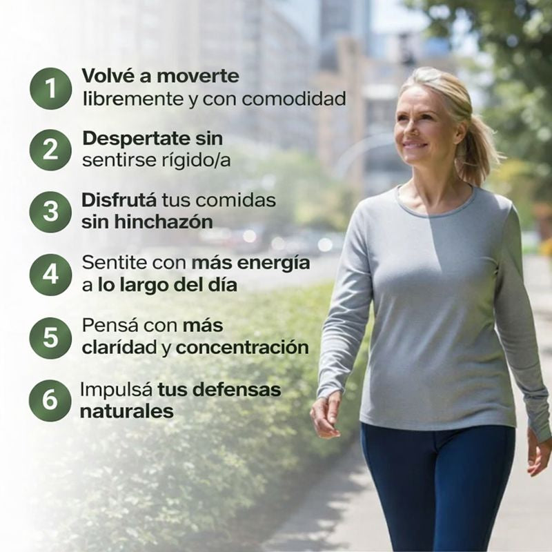 Ideal para personas de mediana edad o mayores que sienten rigidez matinal, inflamación leve, cansancio o menor flexibilidad y quieren una solución natural antes que medicación fuerte o tratamientos invasivos.